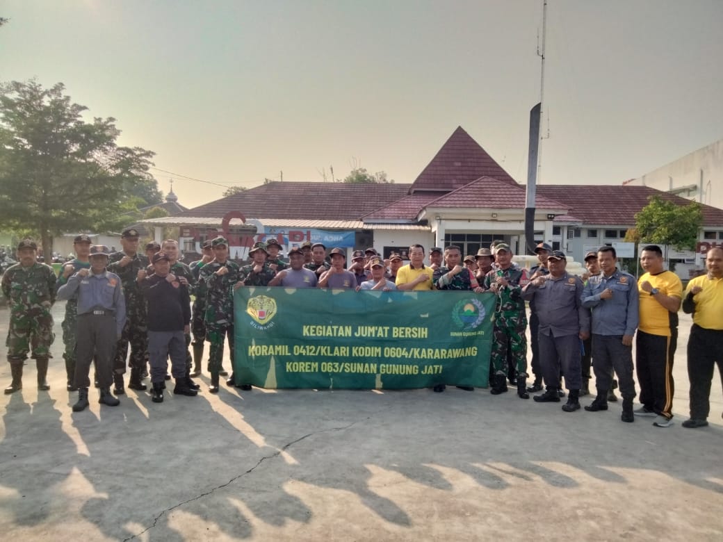 TNI-POLRI Khususnya Koramil 0412/Klari, Kodim 0604/Karawang, melaksanakan kegiatan gotong royong bersama Sektor 18, Polsek Purwasari dan masyarakat dalam rangka kegiatan program jumat bersih di Kantor Kecamatan Purwasari, Desa Sukasari, Kecamatan Purwasari, Kabupaten Karawang. Jumat (26/7/2024).