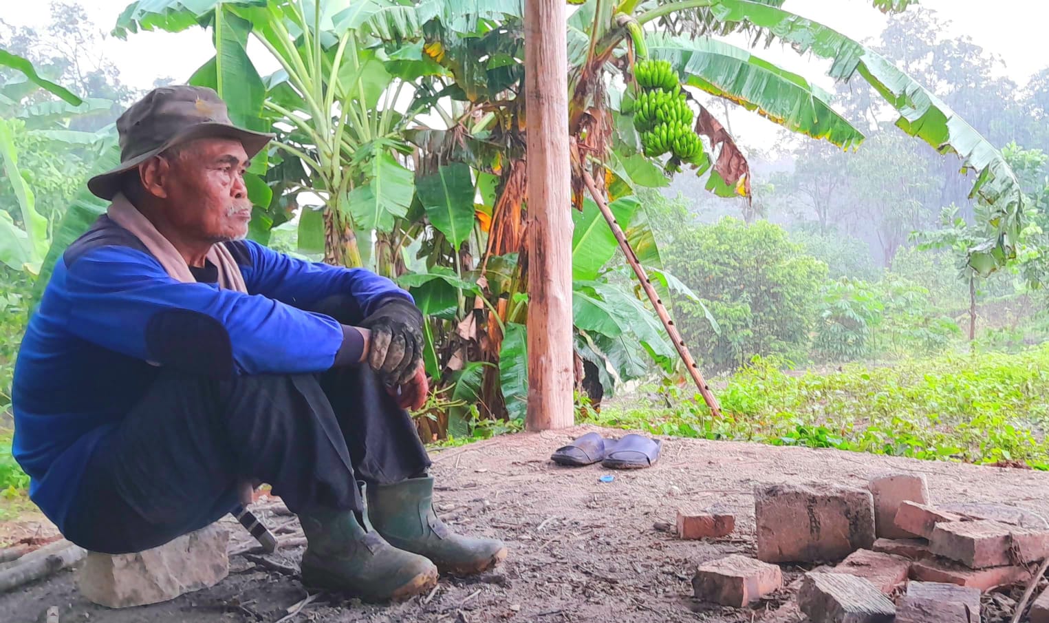 Foto : Bah Kanawan penggarap lahan di Karawang saat melepas lelah usai menggarap pertaniannya ( Rohendi)
