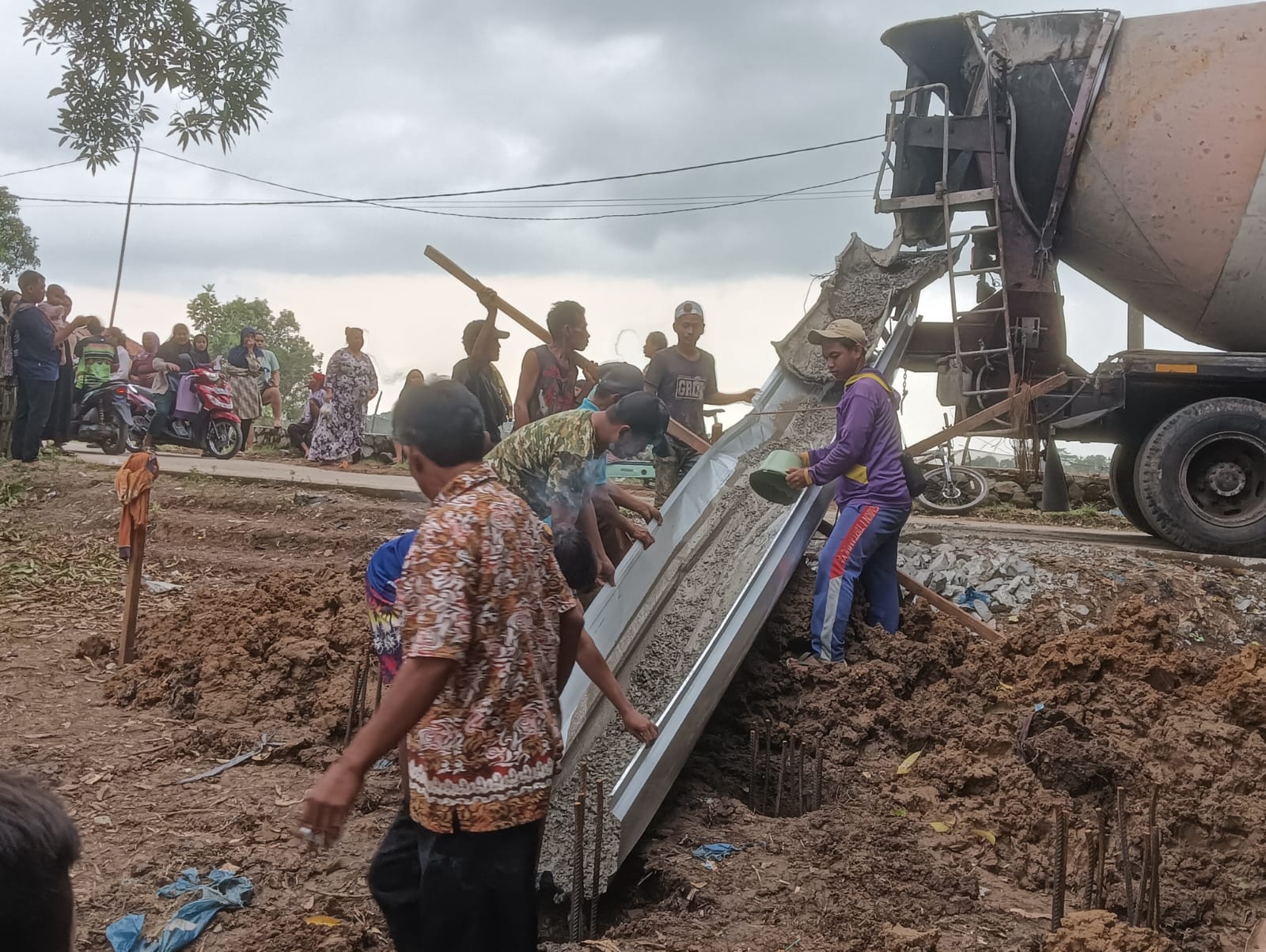 Personel TNI dari Kodim 0604/Karawang bersama warga setempat terpantau bahu-membahu melaksanakan pengecoran dalam proyek pembangunan Jembatan Perintis Garuda Tahap III & IV.